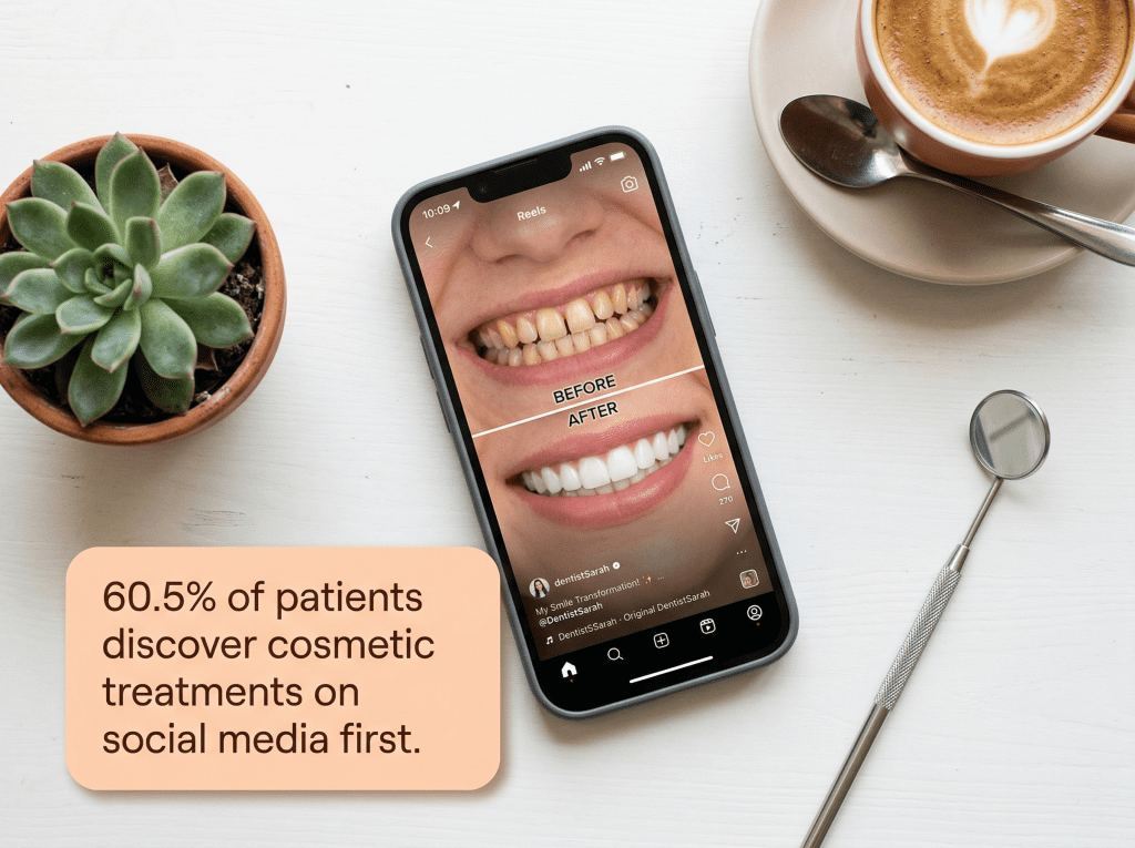 For cosmetic and elective procedures, yes. A peer reviewed patient study found that 60.5% of patients used social media as their first source of information about aesthetic treatments like veneers, whitening, and Invisalign. Short form video (Reels, TikTok, YouTube Shorts) showing before-and-after transformations, office tours, and the personality of the dentist and staff drives discovery. For general dentistry (cleanings, emergency visits), local SEO and Google Business Profile remain more effective acquisition channels.