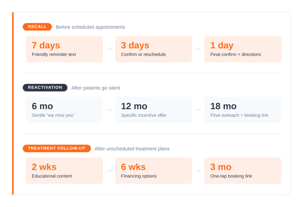 Automated communication systems handle the three biggest attrition drivers. Recall sequences send text reminders before scheduled appointments. Reactivation sequences reach out to patients who have been inactive for 6, 12, or 18 months. Treatment follow-up sequences reengage patients who received a treatment plan but never scheduled. Two way texting, direct booking links, and financing information in followup messages reduce the friction that causes patients to delay or disappear.