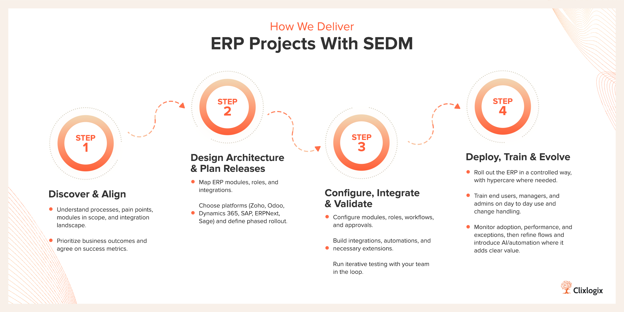 Every ERP project we run follows the Structured ERP Delivery Model (SEDM). It gives your team a clear path from discovery to rollout and evolution, with defined checkpoints for risk, adoption, and AI integration.