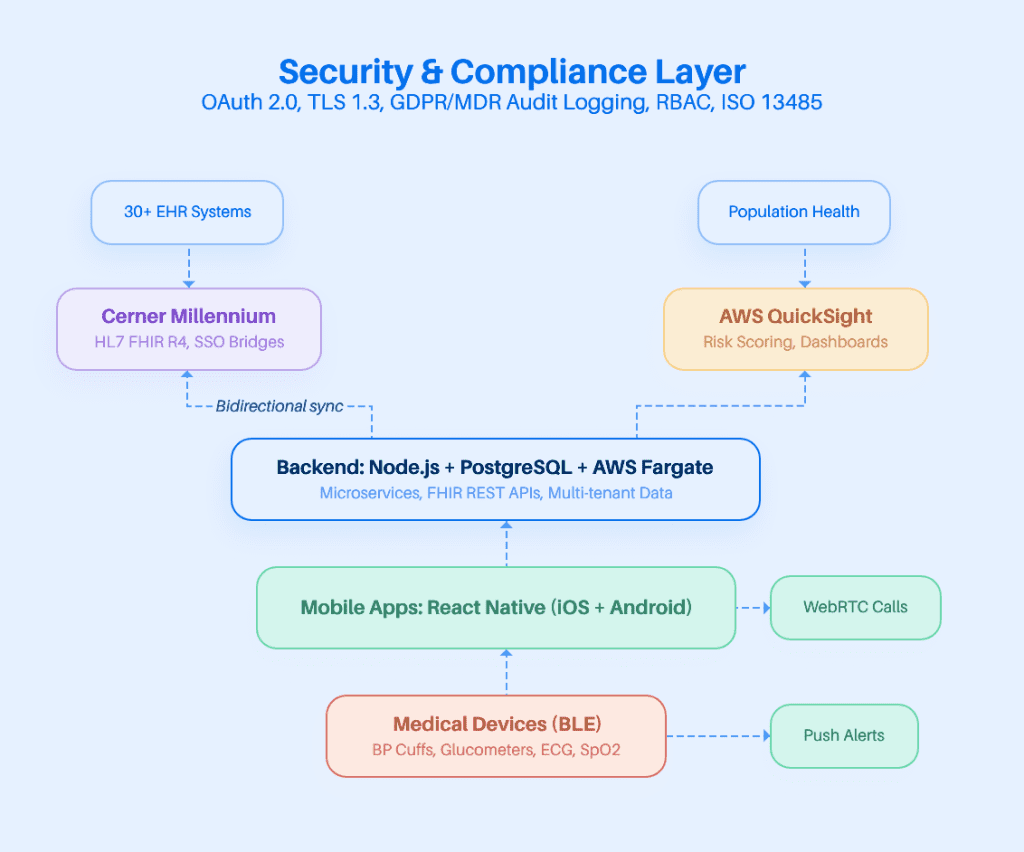 After getting funding, the business case shifted from market validation to platform delivery. The client needed production grade mobile apps with medical device connectivity, FHIR-compliant APIs for interoperability with hospital EMR systems (including Cerner Millennium across the EU network), predictive analytics, and automated compliance infrastructure capable of passing MDR and GDPR audits in 12+ regulatory jurisdictions.