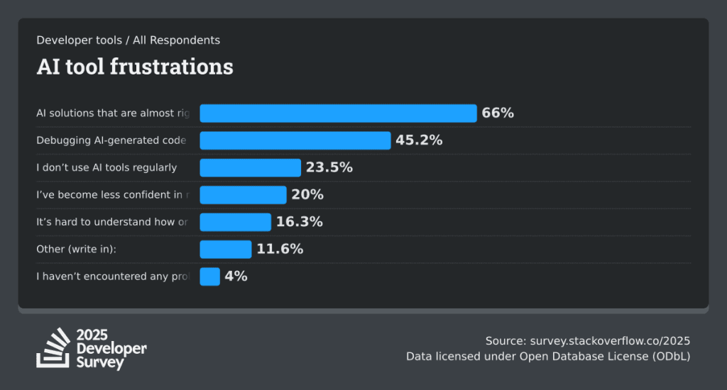 This is the one with the slowest fuse and the clearest example of vibe coding technical debt. Every unnecessary package is a cost you didn’t agree to, compounding quietly in the background. It won’t take your app down today. But it creates a tax on every future change like slower builds, harder upgrades, more surface area for security vulnerabilities. Stack Overflow’s developer survey found that 66% of developers experience near but not right AI output that requires cleanup afterward, and dependency sprawl is one of the most common ways that manifests. Every unnecessary package is a commitment to maintaining someone else’s code indefinitely, and the AI made that commitment on your behalf without telling you.